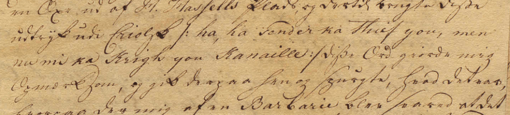 Peter Bakker and Kristoffer Bøegh presented quite interesting information which clarifies the sentence, but also places it in its context. The spelling of Thief (instead of dief ‘to steal, to rob’) and you (instead of joe ‘you’) point to English as the language in which these words from Creole can be represented best. Peter Bakker mentioned that the use of Krigh (Dutch krijgen ‘to get’) instead of kri, which is the common pronunciation in the twentieth century, indicates the consonant at the end of the word was still in use. The use of men is somewhat unclear. I thought it to be a assimilation of manu (Dutch maar ‘but’ nu ‘now’) into men. My colleagues from Aarhus think that the use of Danish men ‘but’ is more obvious.