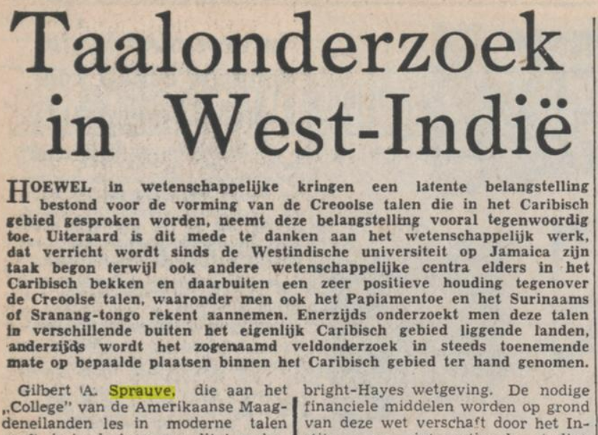 The name Sprauve only appears a few times in Dutch related newspapers. IIn a few cases it refers to the last name of weightlifter Liston Sprauve who became twelfth in the 1968 Olympic Games in Mexico. However, suprise struck us, when we saw the Curaçao newspaper Amigoe dedicated an article to the research by Gilbert Sprauve, whom we know as the one who found out Virgin Islands Dutch Creole was still spoken in the 1960s.