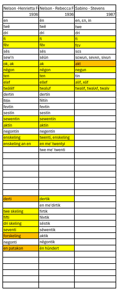 In this figure you will find all numerals from the above mentioned publications. De Josselin de Jong (1926) mentions his informants, however it is unclear who submitted these numerals and whether these were from St. Thomas or St. John. Nelson (1936) collected two sets of numerals, by Henrietta Francis (Fredriksted, St. Croix) and Rebecca Francis (St. Thomas). Robin Sabino learned the language from Alice Stevens in the 1980s. I used her dictionary from Sabino (2012).