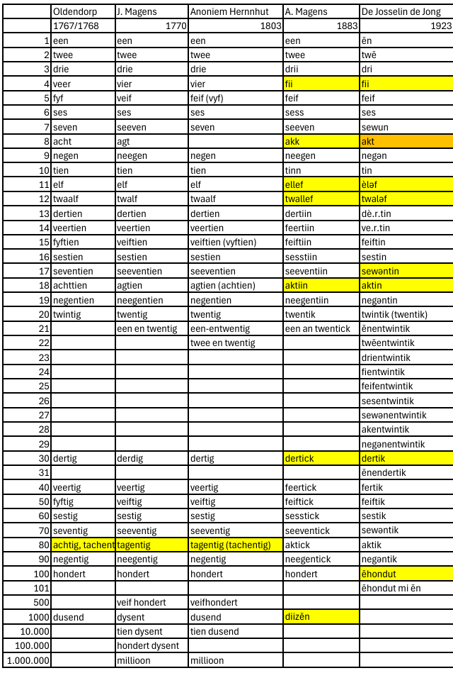 The yellow words are remarkable. See for instance the words for 80. In 1767/68 both achtig en tachentig are used. Tachtig is as in Dutch tachtig,of which the t may be explained from Old Saxon antathoda. In the words for 80 which were recorded during fieldwork, no initial /t/ is found.