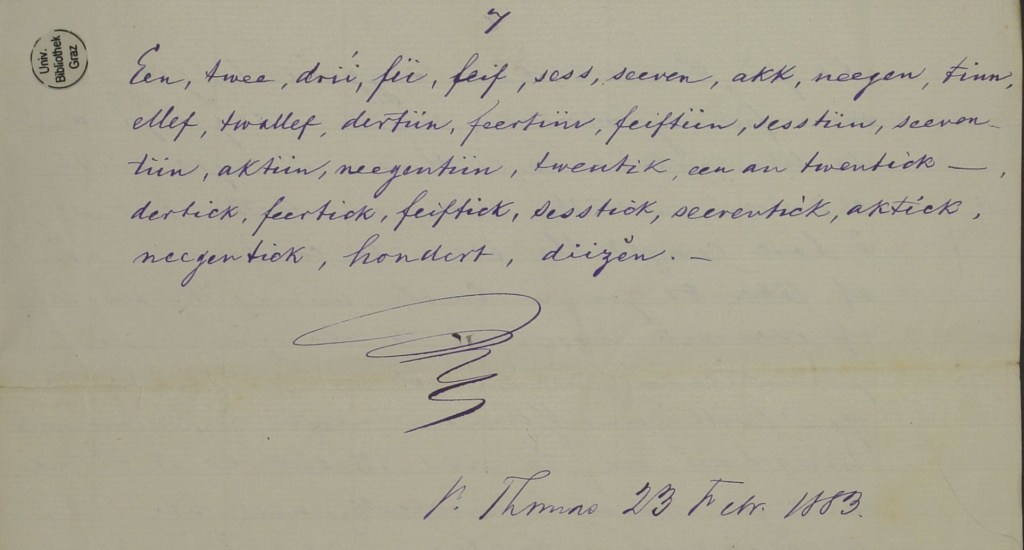 The complete letter is preserved in the archive of Hugo Schuchardt in Graz, and for instance, Peter Bakker, who is currently leading a significant research group on the Virgin Islands Dutch Creole in Aarhus, and his student Sebastian Dyhr, had studied the letter some years ago. Through Sarah Melker, the archivist of Schuchardt’s archive, I received photos of the letter. There is hardly any difference between the letter and its publication in 1914, except for one part on page 7: the numerals.