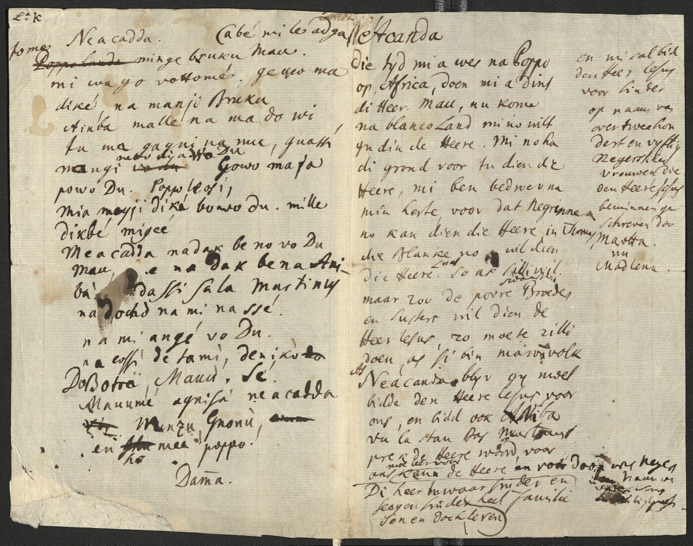 The second letter was written by Damma, also known as Marotta and Madlena. It consisted of two texts: one of them was written in an African language that was unknown to us until recently and the other was a translation of it into Virgin Islands Dutch Creole. In 1742 these letters were published and these were probably the first examples of texts in which enslaved people expressed their emotions in non-European languages.