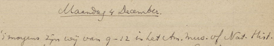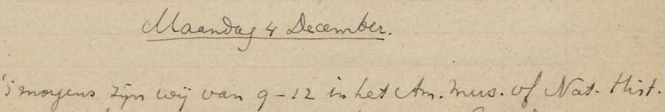 ’S morgens zijn wij van 9-12 in het Am. mus. of Nat. Hist. geweest. Daar wordt [-*on*] de groote kaart van Santo Domingo die we leken gekregen te hebben, in stukken gesneden en op linnen geplakt: er is een boekbinder in het museum. We hebben Mead inlichtingen gevraagd omtrent die aggri-kralen in het