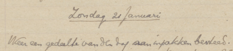 Weer een gedeelte van den dag [*..*+]<aa>n inpakken besteed. Den 29en vertrekt de eerste bezending naar Kopenhagen. Het is nog twijfelachtig wie de vracht betalen zal. [-*H*] De heer Laub zal v.d. OostAziat. Komp. gedaan zien te krijgen dat zij de expeditie-zendingen gratis of tegen zeer lagen prijs overbrengt, [-*….] <en> voorloopig [-heeft] <ol.zal> Hatt deze bezending maar ongefrankeerd afzenden. Ik heb Juynboll verzocht een extra-subsidie van f 750 te vragen of anders deze som uit de gewone subsidie beschikbaar te houden om onze zendingen naar Leiden te betalen. Vanmiddag en vanavond enkele zware regenbuien en harde wind.