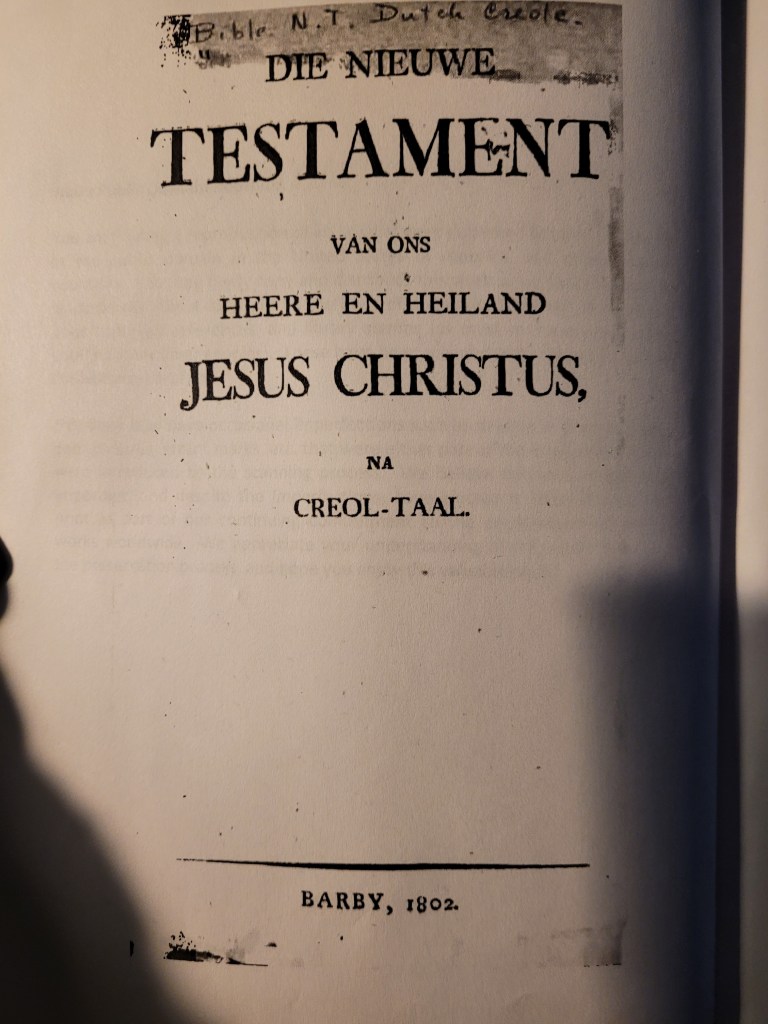 en het Nieuwe Testament uit 1802 (Die Nieuwe Testament van ons Heere en Heiland Jesus Christus, na Creol-Taal. Barby: 1802. [4], 812, [8] pp)