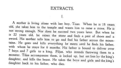 Op 12 februari komen we erachter dat de nieuwe informant William Anthony Joshua (1858) is. Hij is afkomstig uit hetzelfde dorp als Prince. Hij zal de komende dagen maar liefst dertien verhalen vertellen die als I-XIII in De Josselin de Jongs publicatie terecht zullen komen. De verhalen zijn bovendien langer dan die van Prince. Verhaal I, dat nog niet vertaald is, geef ik hieronder met de Engelse samenvatting van De Josselin de Jong. (De Josselin de Jong 1926: 9, 108)