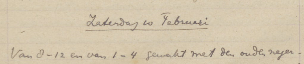 Van 8-12 en van 1-4 gewerkt met den ouden neger. Hij kent de taal goed, hoewel ook hij wel enkele woorden vergeten is. Soms komen ze weer bij hem op onder het vertellen Maar van een ethnol. standpunt beschouwd zijn zijn