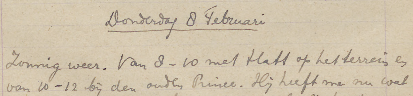 Gewone Zondag. Zonnig weer, alleen ’s morgens en in den avond een beetje regen, korte buitjes. Van ochtend bezoek van de Laub’s, maar wij waren bezig de laatste scherven te sorteeren en ze lieten ons gelukkig aan ons werk. ’S middags enkel brieven geschreven. Voor het middagmaal was Dr. M. onze gast in zijn eigen huis. Hatt heeft al eenige dagen een pijnlijke knie en voelde zich vandaag ook niet heel wel, erg moe. Hij houdt het voor een rheumatische aandoening.