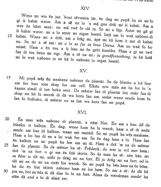 Hieronder een verhaaltje in het Creools dat in de brief van Anthon Magens aan Hugo Schuchardt voorkomt. De Nederlandse vertaling is te vinden in het artikel van Schuchardt uit het Tijdschrift voor Nederlandsche Taal- en Letterkunde dat via een link aan de rechterzijde van deze webpagina te bezoeken is.