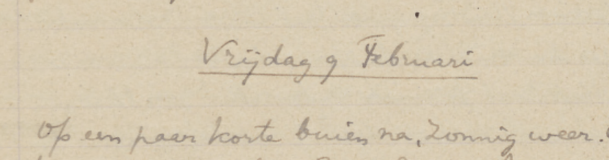 Op een paar korte buien na, Zonnig weer. Na het ontbijt heb ik eerst met Mon Santo Jr. den heuveltop achter hun huis geëxploreerd, waar hij meende vroeger een massa schelpen ontdekt te hebben. Er bleek echter niets te zijn. Om 10 uur was ik terug en ging ik naar Prince. Hatt zat zich te vervelen bij de opgraving want er werd haast niets gevonden; maar enorme hoeveelheden schelpen. Van Prince kreeg ik weer wat tekst, maar geen folklore. Hij had echter ’S morgens een anderen bejaarden man naar ons toegezonden die verklaarde in de taal te kunnen vertellen. Prince’s bedoeling [-*….*] <ol.bleek> weliswaar dat hij voor ons zou werken (graven), maar ik besloot in ieder geval den man op negerholl. te onderzoeken. Om 1 uur verscheen hij weer en tot 5 uur heb ik met hem gewerkt. Hij heeft boven Prince van dat hij niet kan lezen of schrijven en dat hij wil en kan vertellen. Het belooft zoo interessant te worden, dat ik voorloopig al mijn tijd eraan zal geven, wat te gemakkelijker kan daar de opgravingen zoo weinig te doen geven.