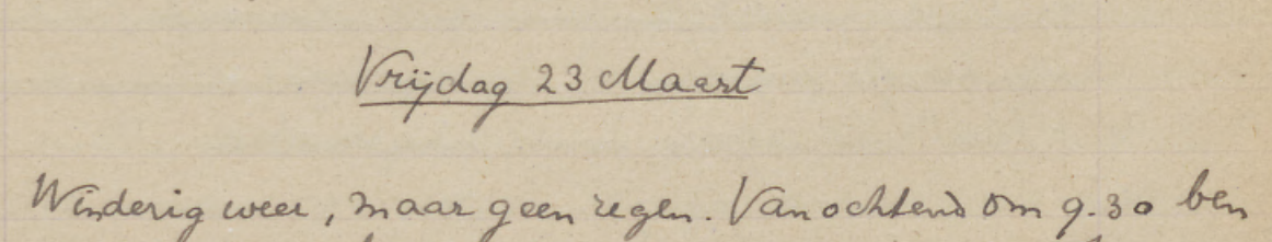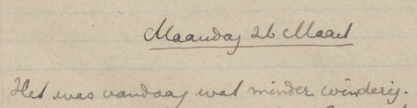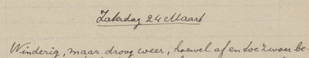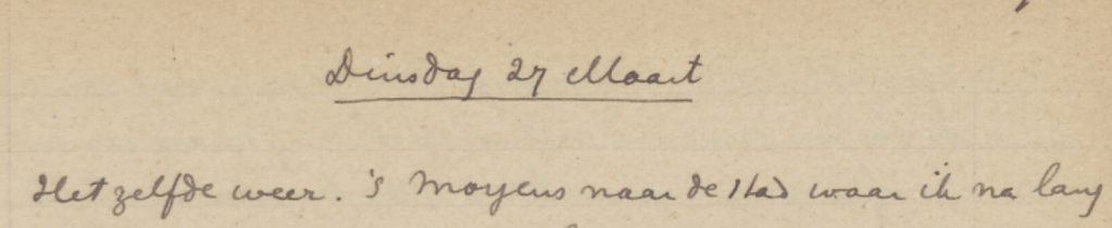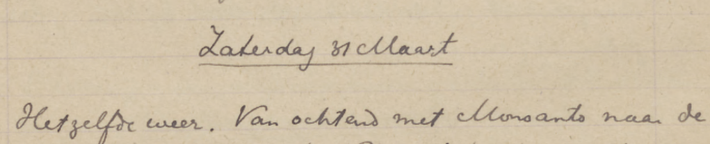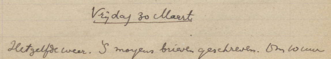 slapen, wat me niet lukte. De rest van den dag (na ‘breakfast’) doorgebracht met lezen, copieëren en brieven schrijven. Het was buitengewoon rustig [-……] vandaag, daar de heele familie behalve ‘grandpa’ bij de Bouscholte-familie was. Jeppesen heeft den heelen middag geslapen. Alleen om 3 uur is hij even uit zijn bed gekomen voor de ‘koffie’, [-…..* ] daar ‘grandpa’ die niet duldt dat men zich aan deze ritus onttrekt, hem zonder pardon wakker riep.