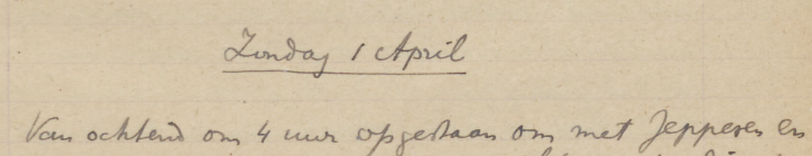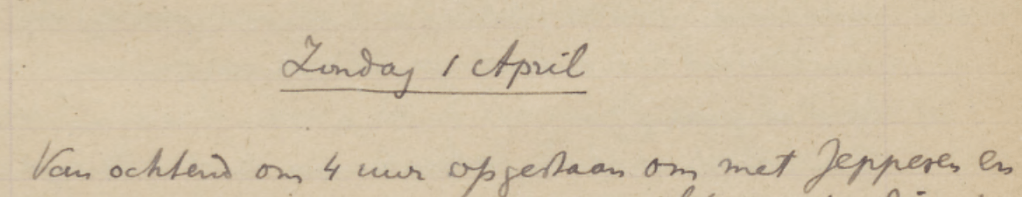 Van ochtend om 4 uur opgestaan om met Jeppesen en Monsanto den merkwaardigen Moravischen dienst op Paaschmorgen bij te wonen. Jeppesen voelde zich tamelijk onlekker, maar hield zich goed. Het merkwaardige van dezen dienst bestaat in een gezamenlijken tocht van uit de kerk naar het kerkhof, waar dan, evenals onderweg, gezongen wordt. Na thuis ontbeten te hebben, zijn Jeppesen en ik in Monsanto’s kleine boot naar Water-Island gezeild om daar te baden. Dit is het beste badstrand dat ik hier heb leeren kennen. [-D] Om half elf waren we thuis en retireerde ik mij naar mijn kamer om wat te