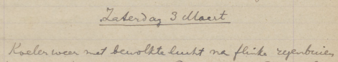Koeler weer met bewolkte lucht na flinke regenbuien ’s nachts. Hatt heeft met Pen vandaag Browns Bay geexploreerd maar niets gevonden. Daar wij dit verwachtten ben ik thuis gebleven om wat negerhollandsch op te nemen. De oude man dien Pen me daarvoor had aanbevolen bleek de taal goed te kennen maar van de oude verhalen veel vergeten te zijn. Hij zal nu bij een ander die wel de verhalen maar niet de taal kent zijn geheugen gaan opfrischen en me dan de volgende week alles vertellen.[1] Mevr. H. werkte vandaag weer aan [-de] haar opgraving op Carolina Estate dichtbij huis. Deze opgraving zal nu ook wel gauw gestaakt worden. Pen, die steeds niet de grootste belangstelling ons werk volgt en aan [-de] <ol.alle> [-moesten] exploratietochten heeft deelgenomen, is nu besloten om, indien hij verlof kan krijgen, mij als volontair assistent naar de Nederl. eilanden te vergezellen. ’t Is te hopen dat hij zijn verlof krijgt, want ik zou een buitengewoon goede hulp aan hem hebben.
