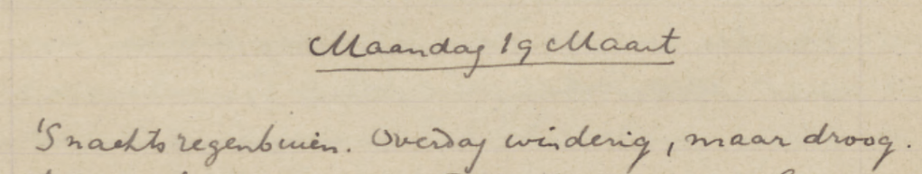 ’S nachts regenbuien. Overdag winderig, maar droog. Ik heb den heelen dag met Roberts gewerkt. Eenige verhalen die hij me deed had hij blijkbaar zelf in elkaar geflanst maar ze waren interessant om de woorden. Na [-*de de*] het 3e heb ik hem gezegd dat ik nu genoeg van dit soort had. Zijn voorraad is nu weer uitgeput, maar als hij zich nog wat te binnen kan brengen zal hij morgen komen en aan Joseph laten weten dat die niet moet komen. Als hij morgen niet komt, komt hij misschien Donderdag. Penn heeft me nog een en ander over den gouvernementsarts hier meegedeeld. Toen hij hier aankwam was er geen huis voor hem. Hij is toen eenige maanden bij de