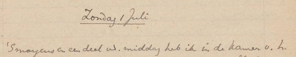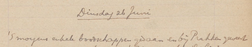 ’S morgens en een deel vd. middag heb ik in de kamer v.h. openbaar ministerie brieven zitten schrijven. Ik kan ook gebruik maken van de raadzaal. ’S avonds om 7 uur naar de Ned. Herv. kerk. Klein gehoor, hoofdzakelijk vrouwen. Na afloop met den heer Lampe mee naar diens huis, waar ook de predikant en de gezaghebber kwamen. Lampe’s moeder heeft progress. paral; zij kan niet goed meer praten.