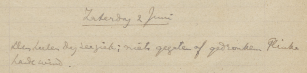 Den heelen dag zeeziek; niets gegeten of gedronken. Flinke harde wind.