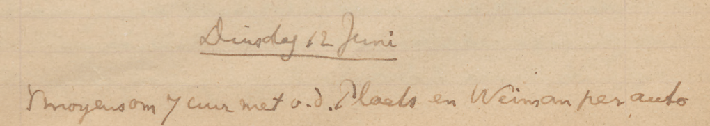 ’S morgens per vrachtauto met Molengraaff naar het terrein ten O. v.h. Schottegat om te zoeken naar de Ind. nederzetting die daar nog in historischen tijd geweest moet zijn. Eén kleine scherf gevonden die zeker Indiaansch is en verscheidene die min of meer twijfelachtig zijn. In geen geval is het de moeite waard daar te graven. Vóór 12 waren we weer thuis. ’S middags wat gelezen en geschreven [-*..*]. Na het eten de van der Plaatsen naar de Stuyvesant gebracht; vandaar naar de familie Bergman, waar ik den avond doorbracht