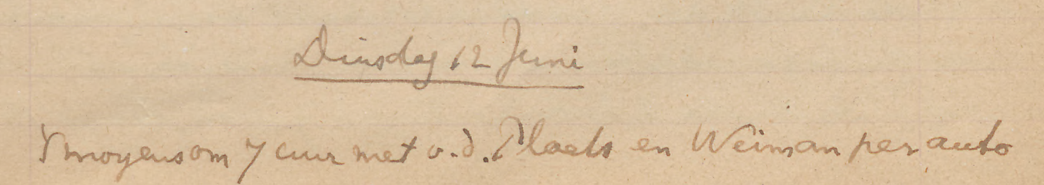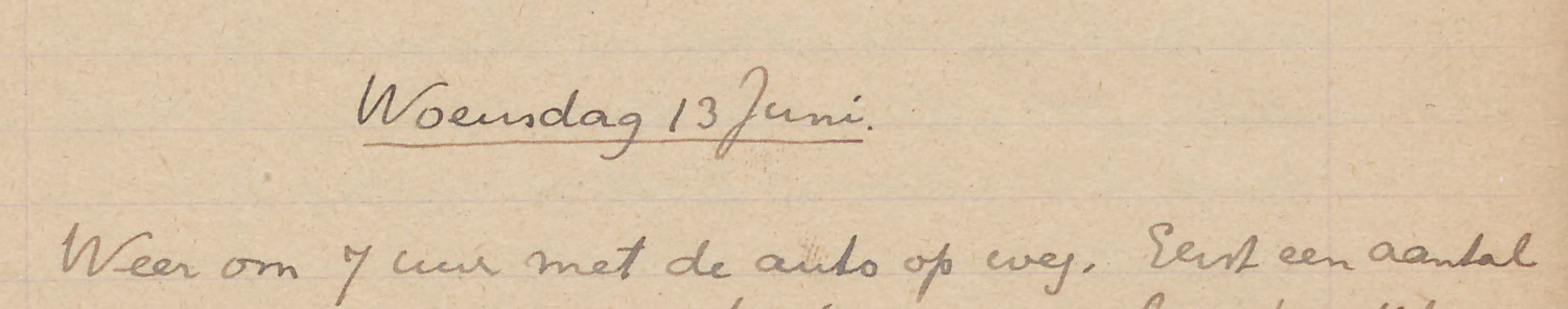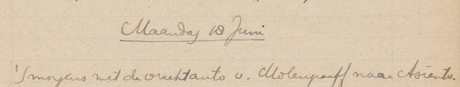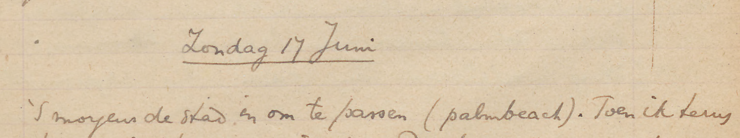 ’S morgens per vrachtauto met Molengraaff naar het terrein ten O. v.h. Schottegat om te zoeken naar de Ind. nederzetting die daar nog in historischen tijd geweest moet zijn. Eén kleine scherf gevonden die zeker Indiaansch is en verscheidene die min of meer twijfelachtig zijn. In geen geval is het de moeite waard daar te graven. Vóór 12 waren we weer thuis. ’S middags wat gelezen en geschreven [-*..*]. Na het eten de van der Plaatsen naar de Stuyvesant gebracht; vandaar naar de familie Bergman, waar ik den avond doorbracht