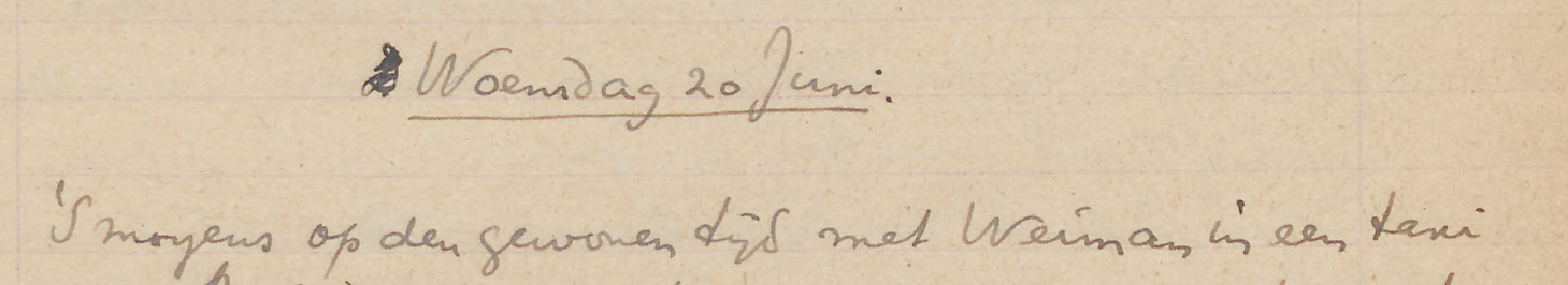 ’S morgens op den gewonen tijd met Weiman in een taxi naar Brievengat vertrokken om nogeens goed te zoeken naar de Ind. nederzetting die daar geweest moet zijn. Weiman liet ik achter bij den ingang van de plantage om daar de zakken en werktuigen te bewaken – ik heb toch niets aan hem – en zelf ging ik het heele terrein zijstapsgewijs door. [-*…*] Tegen 12 uur vond ik de nederzetting ook; er is echter bijna niets te halen. Om 1 uur waren we weer thuis. [-’S mi] Weiman afgedankt. ’S middags eerst brieven geschreven en om 4.30 met de vd. Plaatsen per auto naar het struisvogelpark waar we de vogels bewonderden, gelaafd werden met limonade en struisveeren moesten koopen. Temp. 6 a.m. 78o; 2 p.m. 86o; 10 p.m. 78o.