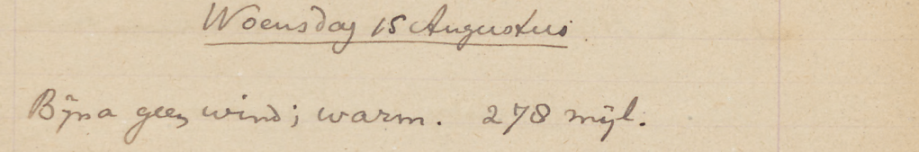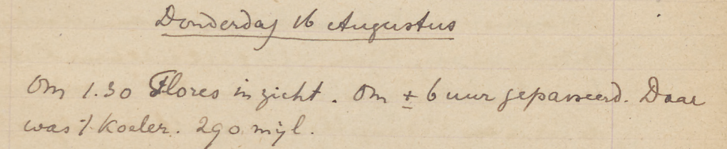 Om 12 uur ’s middags voor Scheveningen. Ongeveer 2 uur de pieren v. IJmuiden binnengevaren. Door allerlei oponthoud pas om 7 uur aan de Surinamekade, Amsterdam.