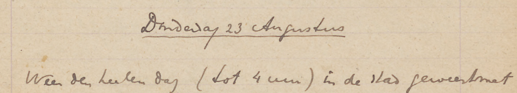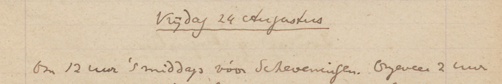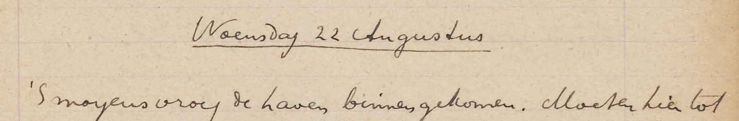 Om 12 uur ’s middags voor Scheveningen. Ongeveer 2 uur de pieren v. IJmuiden binnengevaren. Door allerlei oponthoud pas om 7 uur aan de Surinamekade, Amsterdam.