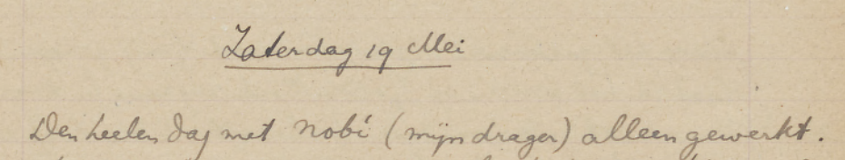 Den heelen dag met Nobi (mijn drager) alleen gewerkt. Maandag hoop ik er drie man bij te krijgen. Het aardewerk dat tevoorschijn komt is buitengewoon interessant. ’S Avonds Philipszoon op bezoek. Temp. 7 a.m. 76o; 12: 82o.