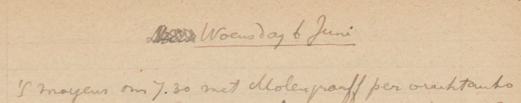 ’S morgens eerst een klacht over de Johanna geschreven, bestemd om aan den gouverneur en aan den min. v. Kol. te worden toegezonden. Vervolgens naar Molengraaff, die met mij naar Meerdink, insp. v. onderwijs, zou gaan om dien te ondervragen over oude literatuur. Dit bezoek leverde niet heel veel op. Veel van die oude literatuur schijnt in zee te zijn gegooid en hss v. Hamelberg over de Bovenw. Eil. zijn volgens Meerdink in het rijksarchief. ’S middags nog een paar boodschappen gedaan en brieven geschreven. Van der Plaats kan niet met de Venezuela mee. Er is geen plaats. Het blijkt nu, dat het de schuld v.d. gouverneur is.