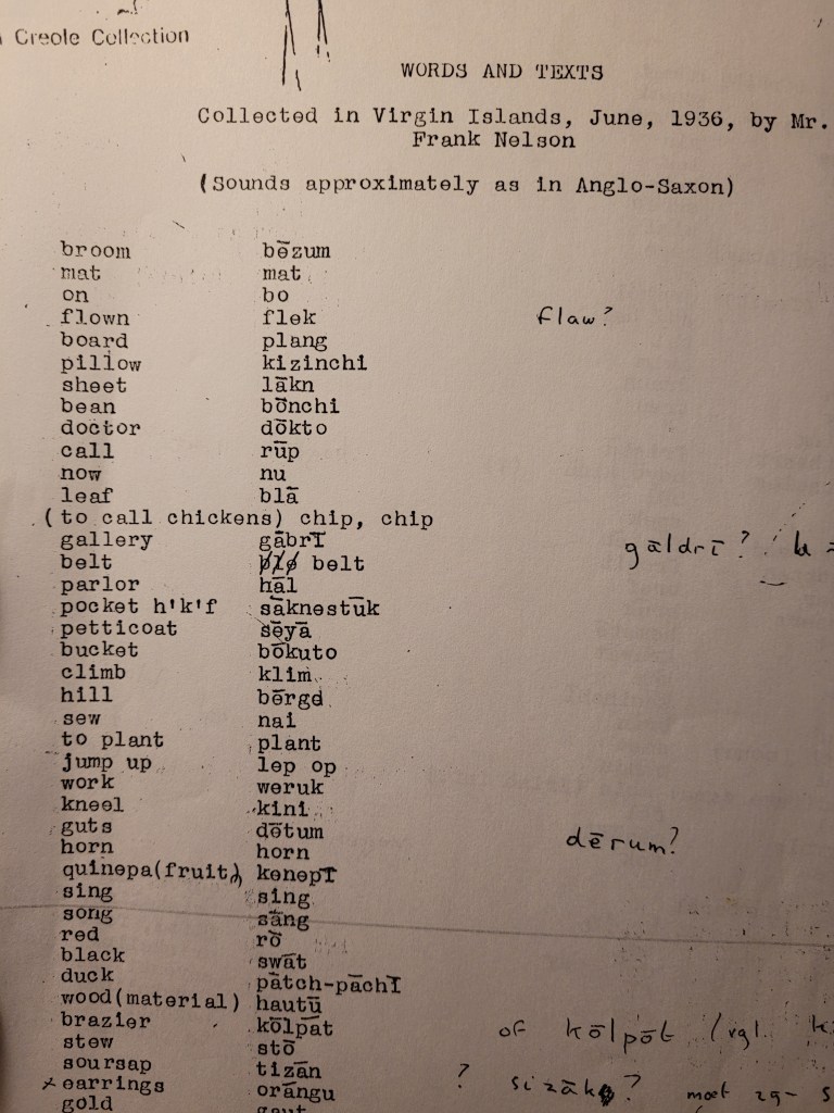 Een van de meest interessante teksten in het Virgin Islands Dutch Creole is de acht pagina’s tellende woordenlijst die de Amerikaanse onderzoeker Frank G. Nelson in 1936 maakte. De woorden en teksten in dit typoscript laten, tien jaar na het veldwerk van De Josselin de Jong, het werkelijk gesproken Virgin Islands Dutch Creole zien. Maar… toen wij in 1993 op zoek gingen naar de lijst om op te nemen in Die Creol Taal, 250 Years of Negerhollands Texts, stond ons een aantal bijzondere verrassingen te wachten. In drie delen nemen we de lijst en de verhalen eromheen door.