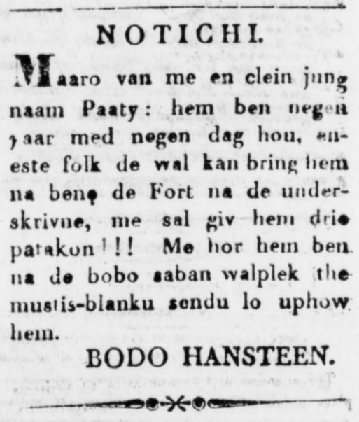 All texts are interesting, but the following is perhaps the most moving. In Enrique Corneiro’s 2018 book Runaway Virgins, Danish West Indian slave adds, several advertisements contain information about the enslaved people being speakers of Dutch Creole. However none of the ads is written in Creole. Rasmus Christensen found the following text (Hansteen, B. (1817, January 23). ‘Notichi’. St. Thomæ Tidende. http://hdl.handle.net/109.3.1/uuid:05863d96-89b4-4272-8dd1-7d91bf06385d)
